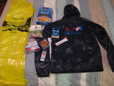 entire bottle of vitamins, not to mention an assortment of granola bars, cereals, a rain poncho and such. The jacket is actually pretty nice - it's a lightweight windbreaker, perfect for those breezy, cool fall days. I was curious if it was also waterproof, so I ran the sleeve under a streaming faucet for about 20 seconds and only a little bit of moisture got through. So I think it would keep a person pretty dry in a light rain shower. Not too shabby for a $96 CAD entry fee (which is like, what, $20 USD? Kidding! I'm kidding!!!).